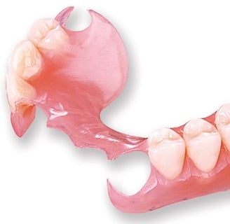 Permite substituir os ganchos metálicos das próteses parciais removíveis com vantagem estética evidente. Ás vezes os grampos das flexíveis são chamados de invisíveis, ou diz-se que as próteses de silicone não têm ganchos, o que não é verdade. Existem sim, mas na cor da gengiva ou dos dentes, por isso menos percetíveis. Além de eliminar o metal que fica evidente ao falar e sorrir, o dispositivo flexível recompõem os dentes faltantes com cores mais naturais (o dispositivo protético é praticamente imperceptível).