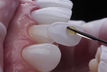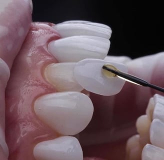 É o nome popular para as facetas laminadas que podem ser feitas de cerâmica ou resina, embora as de cerâmica sejam mais usadas. São lâminas extremamente finas, quase transparentes, que são coladas na superfície de cada dente para melhorar a aparência, corrigir o formato, posição e cor.
